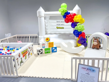 This 8x10' play area includes 4' square ball pit with slide, 6 6" blocks, 2 animal hoppers and our 6x6' white bounce house.