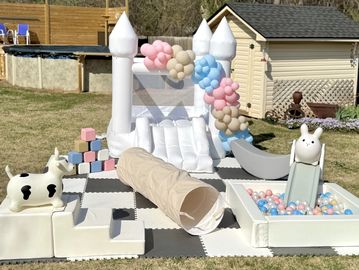 This 10x16' play area includes 5' square ball pit with soft play wedge, tunnel climber, double rocker, 6 10" soft play blocks, 2 animal hoppers and our 8x8' white bounce house.